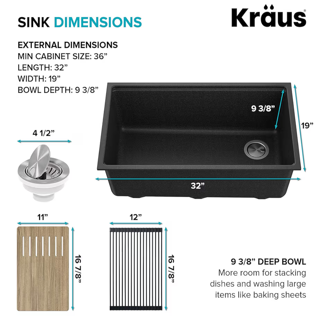 KRAUS Bellucci Workstation 32 in. Undermount Granite Composite Single Bowl Kitchen Sink in Metallic Black with Accessories with WasteGuard™ Continuous Feed Garbage Disposal,