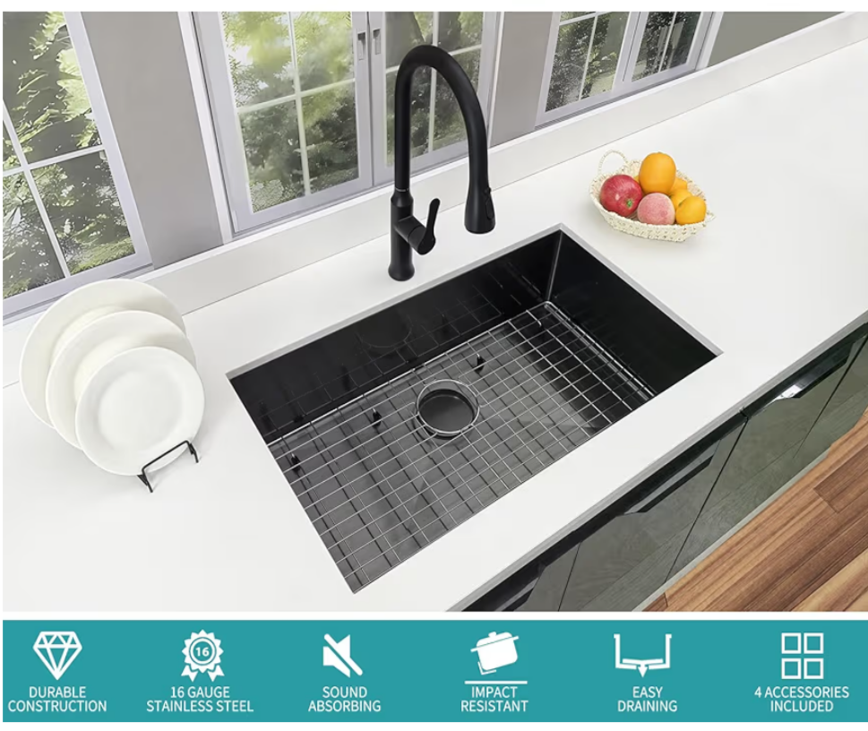 32 Inch Black Kitchen Sink Undermount - 16 Gauge Stainless Steel Sinks Single Bowl, 32''x19'' black Stainless Steel sink with 4 Accessories