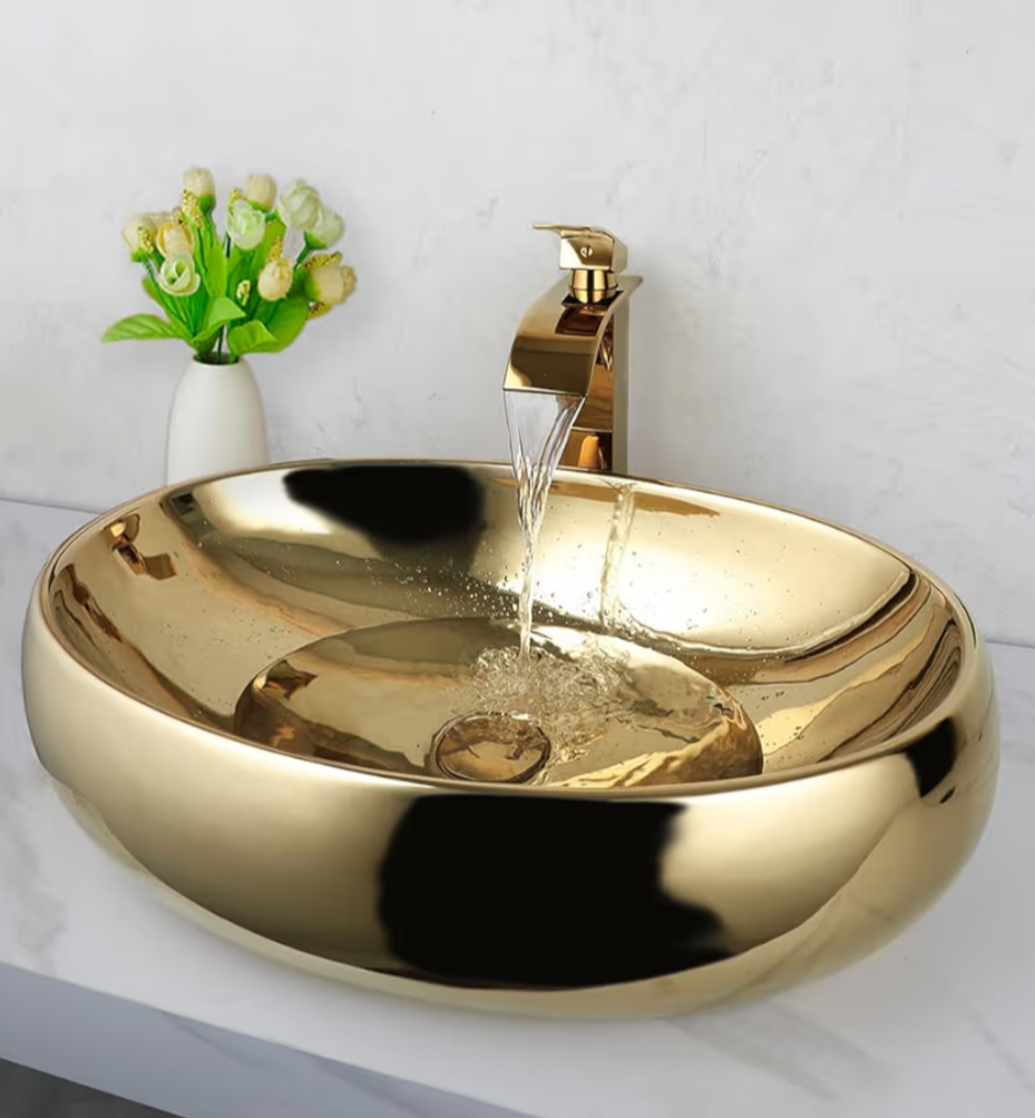KECTIAKL 23 Inch Bathroom Vessel Sink with Waterfall Faucet and Pop-Up Drain Combo,Gold Ceramic Sink Bowl Modern Vessel Sink Above Counter Oval Bathroom Sink Basin